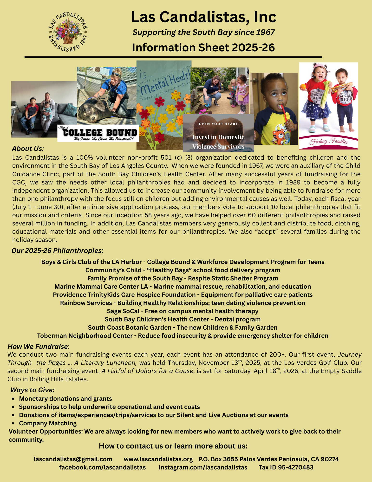 Chef Dora Presents; Bombas; Michaels of Tuscany; Gary Cannon; Portofino Hotel & Marina; Our Southbay Magazine; Michelle Joye & Joe Pace; PV Magazine; Amber Susa, Rise Academy of Dance; Alex Shea; Ed McClure Photography; Magic Castle; Carlos Valdez; Patricia Doherty; Joan Sedillo; Joyce Watnabe; ABC – Jimmy Kimmel Live; Susan Yamate; Medawar Fine Jewelers; Massage Envy; Karen Stockbridge; Janie Hasselman; Loma Secca Winery; LA Maritime Museum; Janis Davis; Sue Spellacy; Emma Gallart; Melting Pot Food Tours; RaiseAway; Nickel & Nickel Winery; Lynn Doran; Clark Brown; Rori Roje; Nancy Pearson; Debbie Sampson; PV Performing Art Center; Rene Wolfer; Basha Wine & Spirits; Doug Smith; Cindy & Jerry Macfarlane; Polly Goodman; Vera & Tad Kelley; Bluewater Grill; Lorri Mino; Gaetano’s; Red Onion; Mary Ross; Irene & Bob Almeida; Herban; Shrimp By You; AMC; Lazy Dog Cafe; Hennessey’s Tavern;